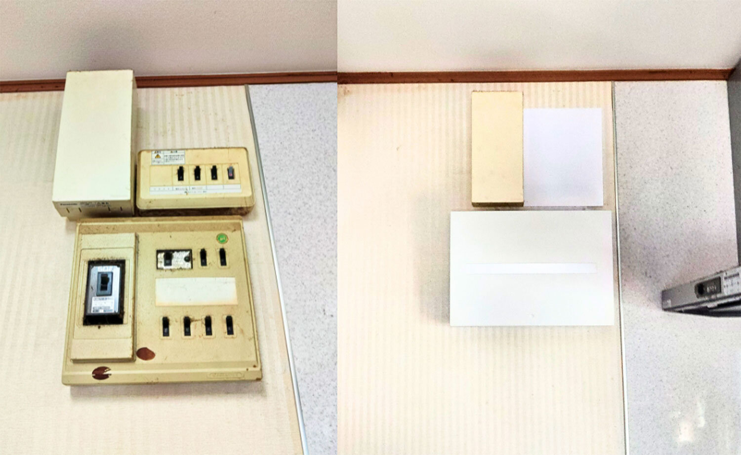 - パワーコンディショナーの交換のほか、増築のたびに増設され二つに分かれていた古い分電盤を一つに集約し、電気系統を分かりやすく整理・更新しました。また、設置から10年が経過し、ご家族の年齢やライフスタイルも変化がおありだったため、旧設備では天井付近にあった非常用コンセントを、配線を延長して床から使いやすい目線の高さへ移設しました。